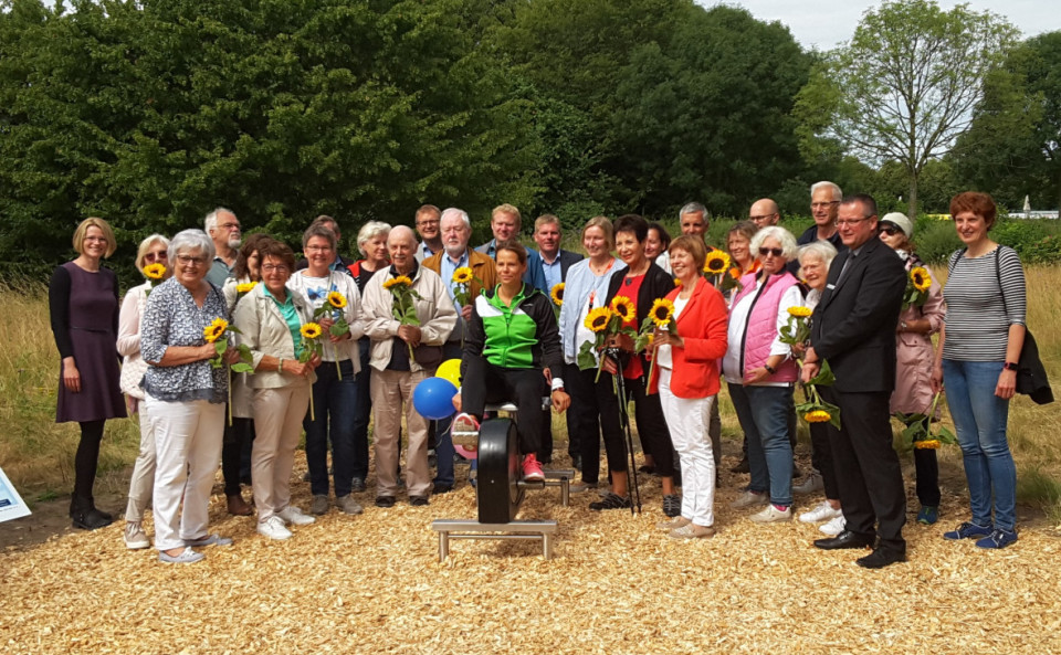 Die ersten fünf von vorgesehenen zehn Übungsgeräten stehen: Im Mecklenbecker Landschaftspark wurde der vom Arbeitskreis „Älter werden in Mecklenbeck“ initiierte generationenübergreifende Freiluft-Fitnessparcours in Betrieb genommen.