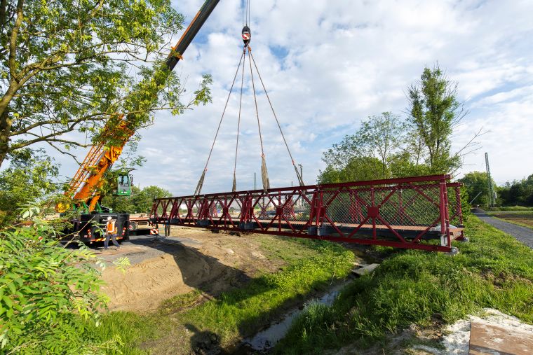 Die eigens für die Bauzeit an der Großbaustelle Heroldstraße aufgebaute Brücke über den Getterbach macht den Umweg für Fußgänger und Radfahrer leicht. Foto: Presseamt Münster„Die Zeit und Energie, die diese Aktionen binden, würden wir sehr viel lieber in den Fortschritt der Baustelle stecken“, sagt Lukas Kirchland von der Bauleitung. „Die Beschädigung von Bauzäunen beschleunigt den Bau der Unterführung Heroldstraße nicht.“ Zudem bedeute das Betreten der Baustelle eine nicht zu unterschätzende Gefahr: Die Bauarbeiter sind mit großen Maschinen unterwegs und rechnen auf dem Baufeld nicht mit „Unbefugten“.