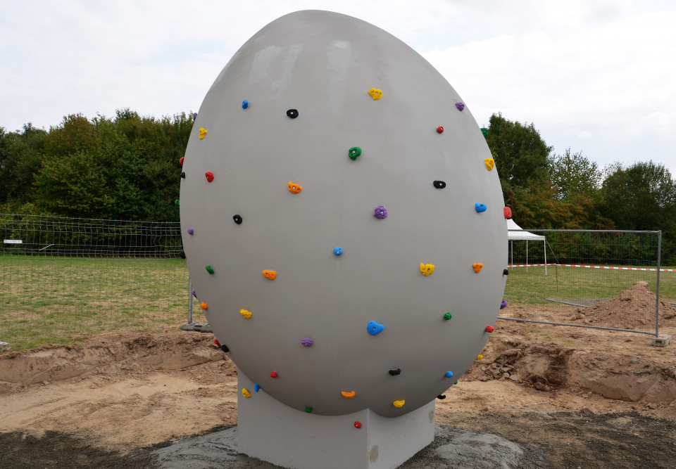 Das Kletter-Ei im Landschaftspark Mecklenbeck wurde heute aufgebaut. Der über drei Meter hohe eyecatcher wird Kletterwilligen künftig hoffentlich viel Spass bringen. Die Rundlauftischtennisplatte steht ebenfalls. Ein weiteres Sportgerät für die Skater, das mehr Schwung in die Anlage bringen soll, geht der Betonierung entgegen. Der Platz für die Entsorgung der Grillkohle wurde zwischenzeitlich schon gepflastert. Es fehlen noch die Sitzmöbel und im Bereich der Boulebahn die Slacklinepfosten. Ziel des CDU Antrages ist es, den Landschaftspark familienfreundlicher zu gestalten.