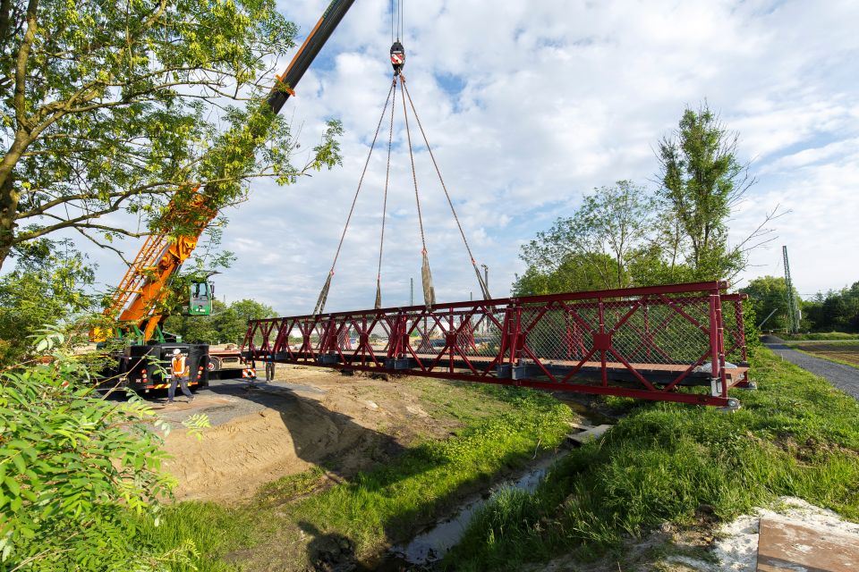 Foto Stadt Münster Die Brücke über den Getterbach ist eingehoben. Auf diesem Weg können Radler und Fußgänger die „Galgenheide“ ab dem Wochenende wieder nutzen.Die Querung über den Getterbach bleibt bis zum Ende des Großprojektes „Heroldstraße“. Wenn alle Arbeiten für den neuen Bahnhaltepunkt und die Straßenunterführung abgeschlossen sind, führt der Weg wieder über den Wirtschaftsweg entlang der Bahn. Das wird voraussichtlich im Jahr 2022 sein. „Die Brücke ist geliehen, am Ende geben wir sie zurück und der Getterbach mäandert abseits der Wegeverbindungen“, beschreibt Teigelmeister das Szenario.
