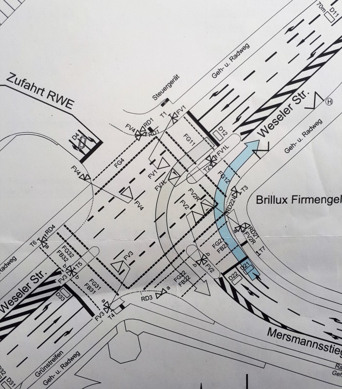 Nach einem tödlichen und einem Unfall mit einer Schwerverletzten wird nun der betroffene Rechtseinbiegerverkehr aus der Mersmannstiege vom Querungsverkehr für Fußgänger und Radfahrer getrennt. Der Rechtsabbiegerverkehr wird dabei gemeinsam mit dem bereits seperat geführten Linksabbieger von der Weseler Str. in die Mersmannstiege geschaltet. Nach der Umschaltung wird es in den Nachmittagsspitzenstunden zu Leistungseinbußen auf der Rechtsabbiegespur kommen. Die Maßnahme soll im Frühjahr 2018 abgeschlossen sein.
