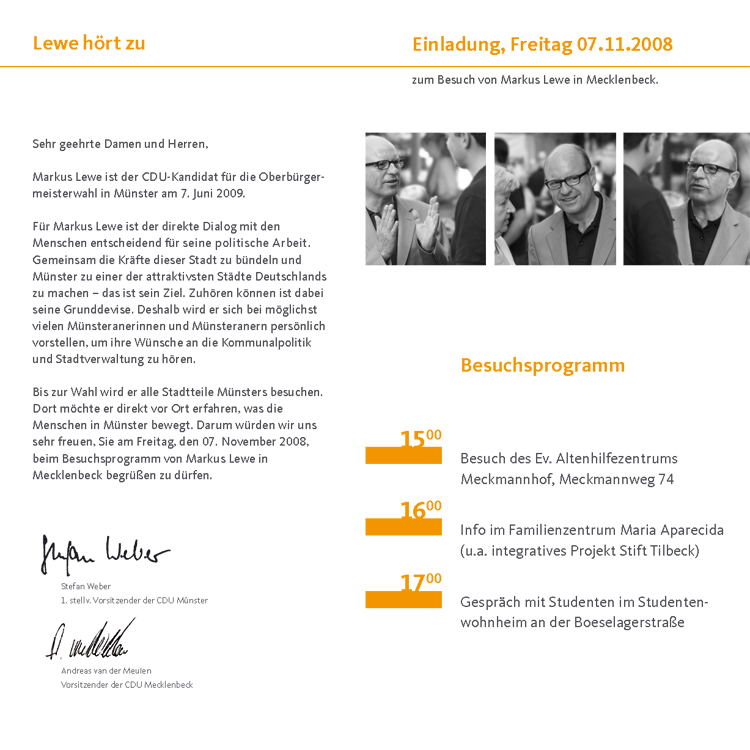Unter dem Motto „Lewe hört zu“ bereist CDU-Oberbürgermeisterkandidat Markus Lewe alle Stadtteile, um mit vielen Menschen in den persönlichen Dialog über Münsters Zukunft kommen. Am Freitag, den 7.11. ist Lewe in Mecklenbeck. „Mein Ziel ist es, gemeinsam mit den Bürgerinnen und Bürgern vor Ort die Kräfte dieser Stadt zu bündeln und Münster zu einer der lebenswertesten Städte Deutschlands zu machen“, sagt Markus Lewe. Deshalb will er sich bei möglichst vielen Bürgerinnen und Bürger in Nienberge persönlich vorstellen, um ihre Wünsche an die Kommunalpolitik und die Stadtverwaltung zu hören.